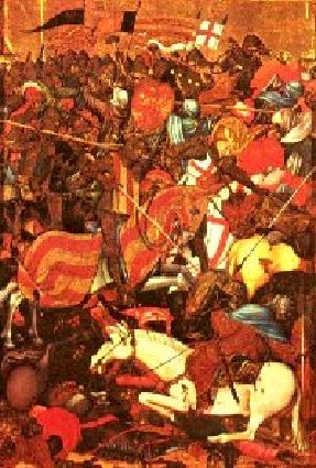 El pintor alemany Marçal de Sas portà a València (va treballar-hi del 1390 al 1410) les fórmules pictòriques dels Paisos Baixos de la dècada de 1380. La seva presència en aquesta ciutat està documentada el 1392, cosa que permet dir que l’art gòtic internacional valencià era contemporani al franco-flamenc. Cal atribuir-li el retaule de la "Companyia del Centenar de la Ploma", fet el 1405. És l’obra més original de la pintura internacional valenciana, pel que fa a la composició i a la relació amb els models flamencs. Destaca el tema central de la Batalla d'El Puig, preàmbul de la conquesta de la València musulmana, on el mateix Sant Jordi, que esdevindrà per açò patró de València, apareix a la batalla i ajuda Jaume I en la victòria. Si açò ocorria en 1238 i Sas ho pinta el 1405, han passat 167 anys i el mestre s’ha documentat de la iconografía dels protagonistes: les quatre barres en que vesteixen cavall i cavaller i la creu de Sant Jordi, perquè mal que li pese a algú, aquests són alguns dels trets d’identitat del País Valencià. Sabem que, com que el mestre es trobava malalt i no tenia recursos, el 4 d’abril del 1410 el Consell de la ciutat de València li concedeix “statge i habitació en cambres contigües a la Casa Sobirana del pes de la farina” per agraïr-li els grans coneiximents que havia demostrat i proporcionat a altres pintors. És coneguda la penúria econòmica que patien pintors, escultors i mestres d’obra, que es caurien tos si veren on estàn penjades avui en dia les seves obres. Així, podem trobar pintures de Marçal de Sas al Metropolitan Museum de Nova York, al Museu de Filadelfia i aquest “unicum” al Victoria and Albert Museum de Londres, on per cert no apareix en cap guia ni catàleg del museu. EL VOLEM A CASA NOSTRA!!!!!