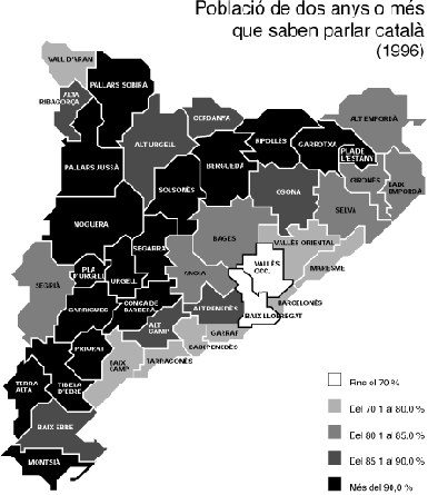 Atès que el territori és un dels components imprescindibles, en la mesura en què és l'espai de trobada dels parlants, qualsevol alteració de la base territorial té un efecte en la vida de la llengua. Així, la reducció de la base territorial d'una llengua pot ser interpretada com a símptoma que la llengua en qüestió està en procés d'extinció. En el cas del català, és suficient pensar en les fronteres lingüístiques de fa dos segles i les actuals per adonar-se que l'afebliment és considerable -n'hi ha prou a pensar en la Catalunya Nord i Alacant-. A aquesta reducció progressiva de les fronteres hem d'afegir, especialment en els darrers cinquanta anys, la funció dels grans centres urbans com a difusors de la llengua dominant. Val a dir que la percepció d'aquest fenomen està molt alterada pel trencament generacional que he esmentat abans. Ningú no pensa en Girona o Vic com a centres difusors de la llengua dominant -més aviat els percebem com la "reserva espiritual" del català-, però, en canvi, ni el Gironès ni Osona no poden ser incloses en les comarques amb els percentatges més alts d'ús del català. Aquesta inèrcia de percepció es manifesta clarament en la interpretació dels resultats del cens lingüístic de 1996 i que La Vanguardia del 16-4-98 destaca així: "El 95% de la población entiende el catal·n". En el mapa que reproduïm es pot veure a primer cop d'ull el motiu de tanta eufòria pel que fa a l'avenç del català (mapa 1).