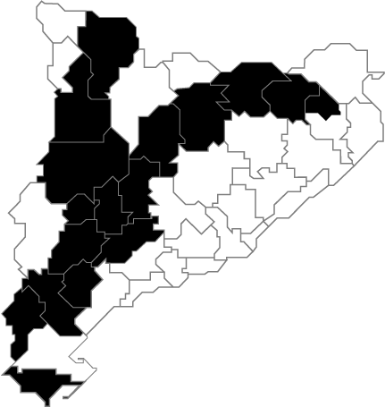 Ara fixem-nos en el mapa: de l'Alt Empordà al Baix Ebre, no hi ha cap comarca costanera on el percentatge de persones que parlen el català arribi al 90% -i em situo en la banda alta de les estadístiques perquè no penseu que vull portar l'aigua al molí dels pessimistes-. El mateix podem dir de les comarques més industrialitzades i, si ens fixem en les comarques pirinenques, ens adonem que, tret del Ripollès i el Pallars Sobirà, la frontera nord mostra un afebliment clar. Cal recordar que el turisme és un fenomen més recent aquí que a la costa; per tant, podem esperar-hi un procés semblant en pocs anys. Si ara ens fixem en les comarques on el català és parlat per més del 90% de la població, el resultat és el del mapa 2.