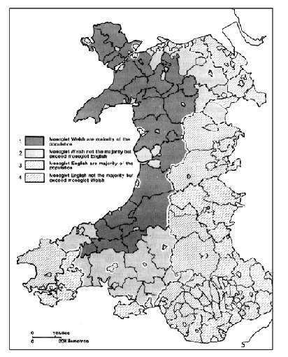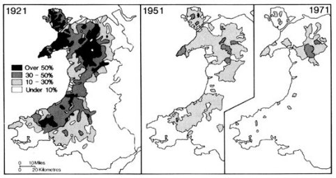 En el mapa 3, on es mostra la reducció de la base territorial del gal·lès, podem copsar una fragmentació del territori per la part central que va implicar un augment de les fronteres i, per tant, de la zona de penetració de l'anglès. Aquesta fragmentació, però, va començar molt abans, com podem veure en el mapa de 1901 (mapa 4).