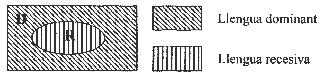 en consideració. De l'anàlisi d'aquests factors, se'n desprèn el concepte de la vitalitat de la llengua en una situació determinada i el seu procés de normalització. Entre d'altres conceptes a considerar, analitzarem concretament la necessitat d'ús de la llengua i la utilitat comunicativa de la llengua en qüestió (en diferents àmbits i de manera global). Com a mostra exposem alguns instruments d'anàlisi que poden servir per a definir els processos de substitució: a)La situació d'inclusió o englobament, segons la quals la llengua dominant [D] és coneguda per tohom i la llengua recessiva [R] només la coneix una part de la població. (v. gràfic 1).