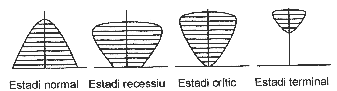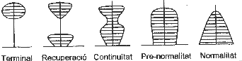 Gràfic 1 b) La situació d'interposició de la llengua dominant en les relacions de la llengua recessiva amb l'exterior. c) Un altre instrument per a definir la situació de substitució és el que podríem anomenar índex de recessió, que és de dos tipus: -Índex geogràfic: a les zones urbanes que marquen les normes d'ús és més implantada la llengua dominant, i la llengua recessiva queda relegada a les zones rurals. -Índex generacional: la gent jove parla més la llengua dominant, i la llengua recessiva queda relegada a la gent de més edat. L'evolució de la piràmide d'edats aplicada a la població de la llengua recessiva dóna una idea clara del procés de substitució. (v. gràfic 2)
