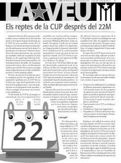 1. Els bons resultats de la Candidatura d’Unitat Popular (CUP) són el reflex de molts anys de feina de la militància, de la implicació d’aquesta militància en diferents moviments populars i d’un esforç molt gran en aquests darrers mesos. Felicitem tota la militància de la CUP pels resultats i, sobretot, per les perspectives que s’obren en aquesta nova etapa. [Continuació]