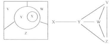 Eliot va percebre molt lúcidament l'estructura essencial típica de la situació minoritària, de la qual la interposició és part integrant. També en va copsar bé la importància històrica. La millor prova del talent d'aquell ideòleg conservador és l'objectivitat d'una descripció independent de les seves pròpies preferències personals, nacionals i de classe. El fet és que volia entendre la situació en primer lloc en comptes de començar (i acabar du même coup) per falsejar-la i suplantar-la. També és un fet que va saber descriure-la en termes adequats i generals, directament aplicables a qualsevol situació anàloga en qualsevol altre racó del món. En comptes de fer un retrat ad hoc, va produir una idea. El passatge que he transcrit és, doncs, un bell exemple de tipificació. A partir d´aquell enunciat, és evident que «la peculiar constel·lació de cultures que hi ha a les Illes Britàniques» és un cas d'un tipus que admet moltes formes variants. A partir d'anècdotes esparses, Dillard que és un observador penetrant i enginyós va saber embastar un quadre molt substanciós. La clau d'aquell panorama era un tema en què molt pocs centren l'atenció: la manera com el món dels Estats Units envolta Puerto Rico fins a tal punt que els natius donen maquinalment per segur que tot extranjero és necessàriament americano. Jo mateix podria reblar els arguments de Dillard amb alguna anècdota redundant de l'època en què vaig fer un curset de Spanglish a la New School for Social Research (al costat mateix del 55 Fifth Avenue on tenia el meu office). Curiosament, Dillard, que treballava en un altre floor del mateix edifici que jo, no coneixia gens el text d'Eliot abans que jo li'n parlés cap a la fi del 1970. Com que el meu propi esforç ha consistit a lligar la construcció teòrica amb l'exploració empírica, vaig veure que l'aportació d'Eliot i la de Dillard es complementaven perfectament. La coherència mateixa entre una idea concebuda dins el context britànic i un mostrari d'escenes antillanes era ben eloqüent. De fet, la tipificació de la interposició esbossada per Eliot era cronològicament anterior a la tematització encetada per Dillard. Sens dubte, Eliot s'havia inspirat en moltes experiències concretes com les recollides per Dillard: Dillard havia entrevist una coherència lògica com l'assenyalada per Eliot. Descobertes dobles d'aquesta mena em convencen més i més que la clarificació de la situació minoritària ha estat començada i abandonada ara i adés en distints llocs. La bibliografia sobre la matèria confirma amb escreix que el discurs dins aquest camp no ha estat gens sistemàtic ni sostingut. És clar que no ha pogut haver-hi gaire progrés cumulatiu quan ni tan sols hi ha hagut gaire comunicació. El meu il·lustre amic Chaim Rabin té raó quan diu que aquest multi-discurs és un exemple patètic de vegades grotesc de dispersió i desconnexió. És clar que, dins el món modern, proverbialment «obert», l'isolament de les «minories» és paradoxal i escandalós. Malauradament, però, és molt explicable i té molt a veure precisament amb la interposició. La meva pròpia aportació, basada en informacions de tota mena, es redueix a tipificar una vegada per totes la interposició tot esbrinant les connexions entre una estructura subjacent característica i un ventall amplíssim d'ocasions empíriques una «simptomatologia», si voleu. Evidentment, un concepte reclama un terme i el significat del terme depèn en definitiva d'una formalització simbòlica, com els físics van descobrir fa algun temps. El mot «interposició» em sembla simplement apropiat fins a nova ordre. En tot cas, es tracta d'integrar la tipificació de la interposició dins una tipificació global de la situació minoritària i reconec que aquest altre rètol em satisfà ben poc. [3] Més: com que descobrim coherències essencials entre la part i el tot, podem dir que la interposició és un aspecte revelador perquè «reflecteix» la situació minoritària, a la manera d'una mostra. Noteu també que podem coordinar ací perfectament la recerca perquè es tracta de fer la mateixa mena d'operació (la tipificació) a dos nivells. Tipificar una mena qualsevol de situació sociolingüística és analitzar-la «internament» i comparar-la «externament». Per tipificar una situació, hem de concentrar-nos-hi i posar-la en relació amb d'altres. Com més a fons l'entenem, més clarament veiem que és una possibilitat perquè el seu propi mecanisme suggereix alternatives; i també viceversa: les alternatives aclareixen el seu mecanisme. En comptes d'un discurs ad hoc, estrictament aplicat a una situació particular, la tipificació forneix un rudiment teòric aplicable i enceta un discurs general. El rudiment serà molt adequat si es revela capaç de desenvolupament coherent en distintes direccions. La tipificació és una etapa de la recerca que obre nous horitzons. Comencem per l'abstracció, que reclama una certa formalització simbòlica feliçment, poc abstrusa. La interposició és essencialment un arranjament topològic (qualitatiu) que podem representar amb un diagrama partitiu i amb un diagrama connectiu, exactament equivalents (fig. 1). El primer és de la mateixa mena que els d'Euler-Venn, molt corrents en teoria de conjunts. I el segon és un graf una xarxa, si voleu.